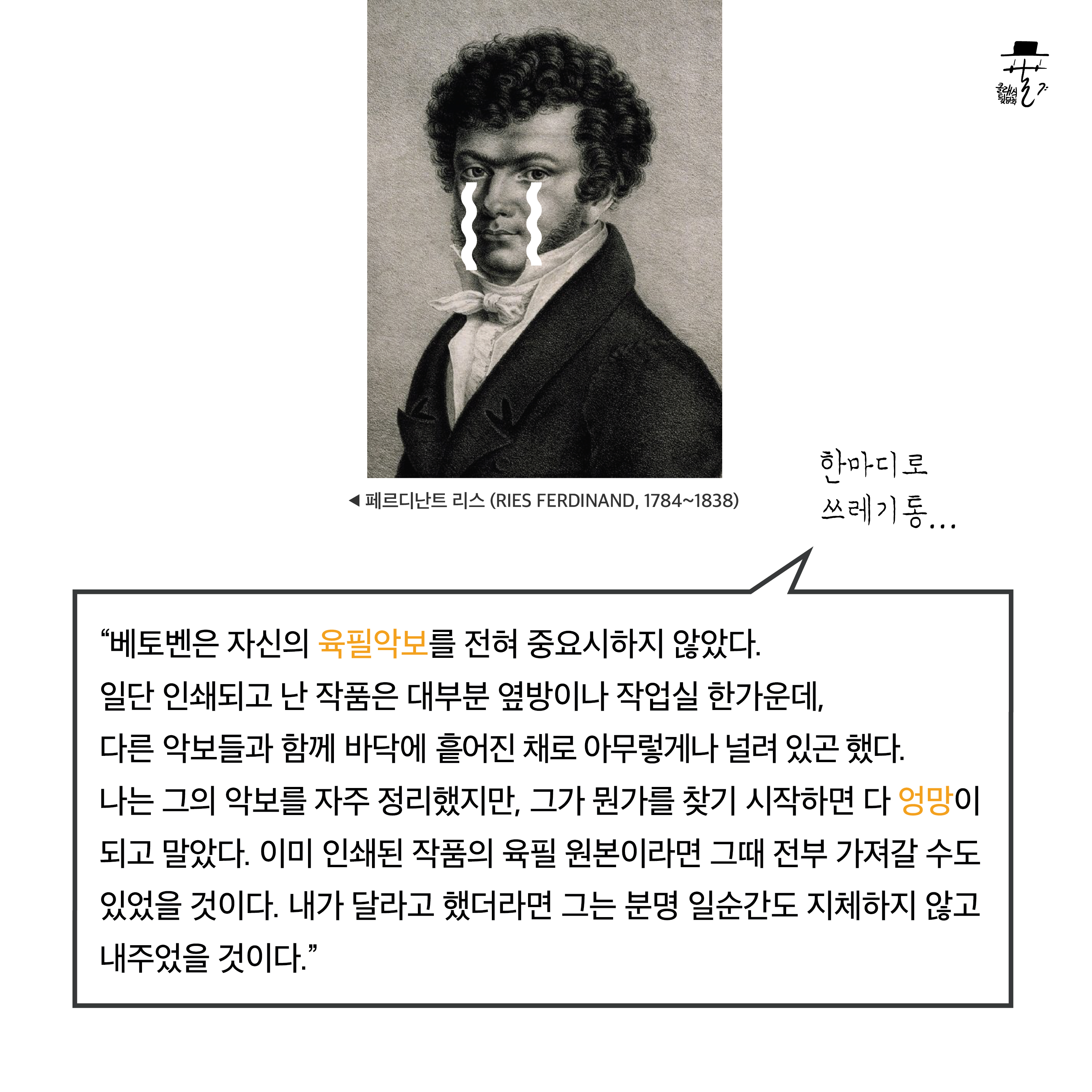 "Beethoven did not value his handwriting at all. Once printed, most of the works were scattered on the floor with other scores in the next room or in the middle of the studio. I used to organize his scores, but when he started looking for something, it was all messed up. If it was the original handwritten copy of the work already printed, it could have been taken at that time. If I had asked for it, he would certainly have given it away without a moment's delay."