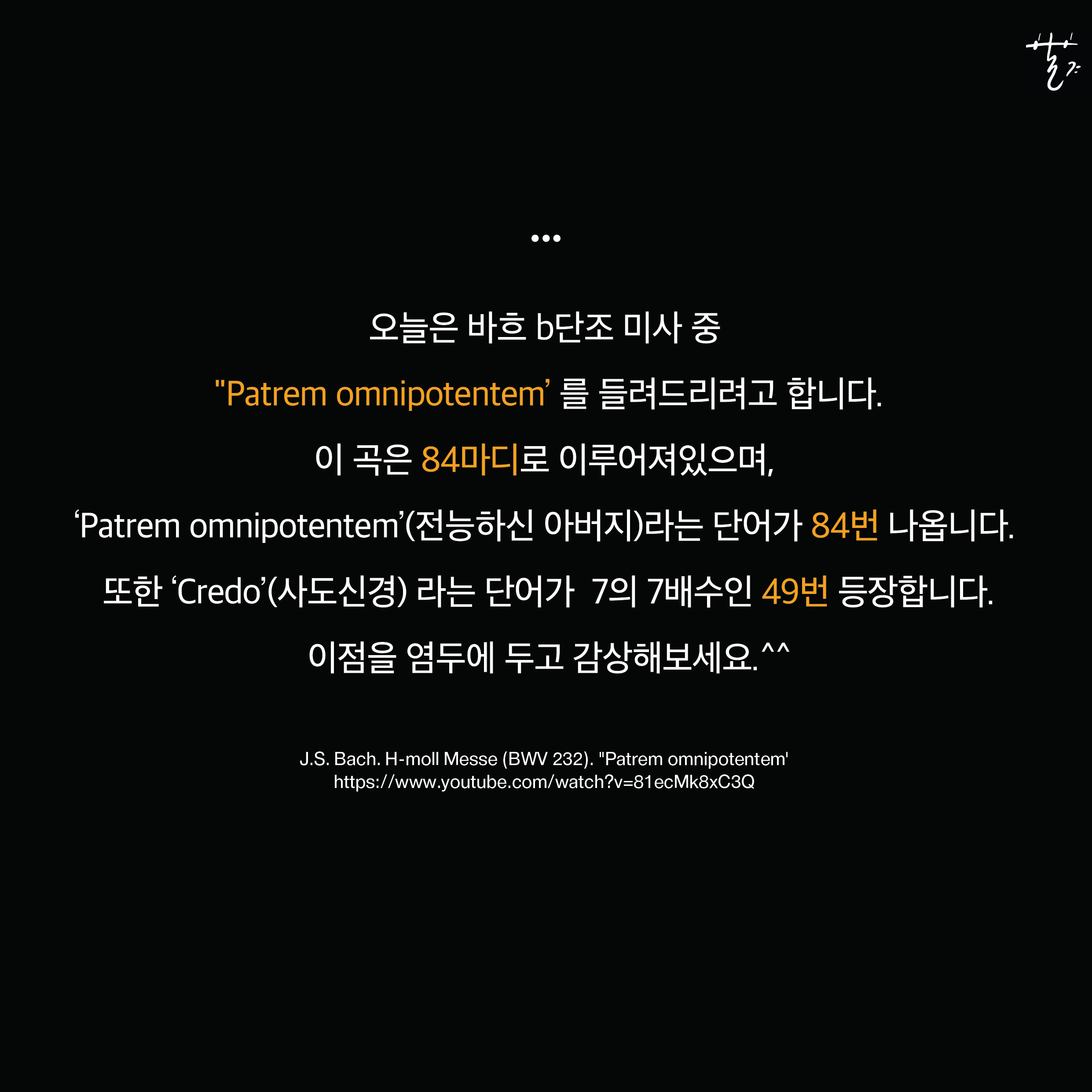 바흐 또한 박자표, 음표 등과 같이 악보를 구성하는 모든 것에 의미를 부여하였고, 특히 하나하나의 숫자에 의미를 부여하여 작곡하는 것을 즐겼습니다.